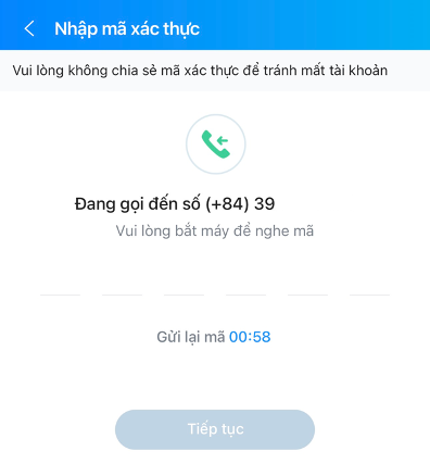 Bước 5: Hệ thống sẽ cung cấp một mã xác thực thông qua số điện thoại của bạn hoặc yêu cầu bạn nhắn tin để nhận mã xác thực. Sau khi nhận được mã xác thực, bạn cần nhập mã để Tiếp tục tạo tài khoản.