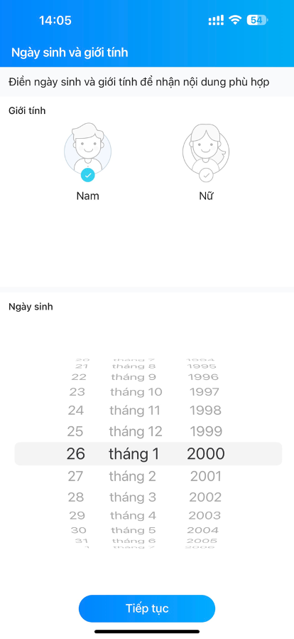 Bước 6: Sau khi mã xác thực được xác nhận, bạn sẽ cần bổ sung thông tin cho tài khoản của mình. Chọn Giới tính và Ngày sinh của bạn, sau đó chọn Tiếp tục.