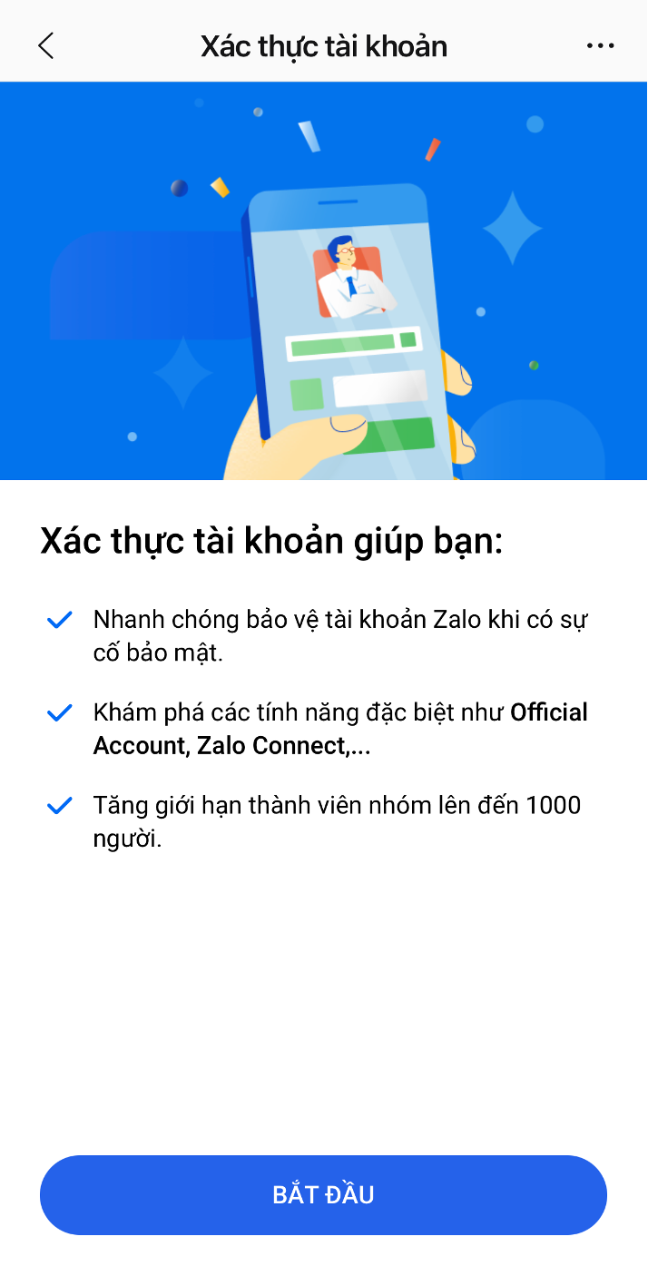 Bước 7: Sau khi hoàn thành quá trình tạo tài khoản, bạn cần thực hiện Xác thực tài khoản để tiếp tục sử dụng các tính năng trên ứng dụng Zalo. Vui lòng làm theo hướng dẫn để tiến hành Xác thực tài khoản.