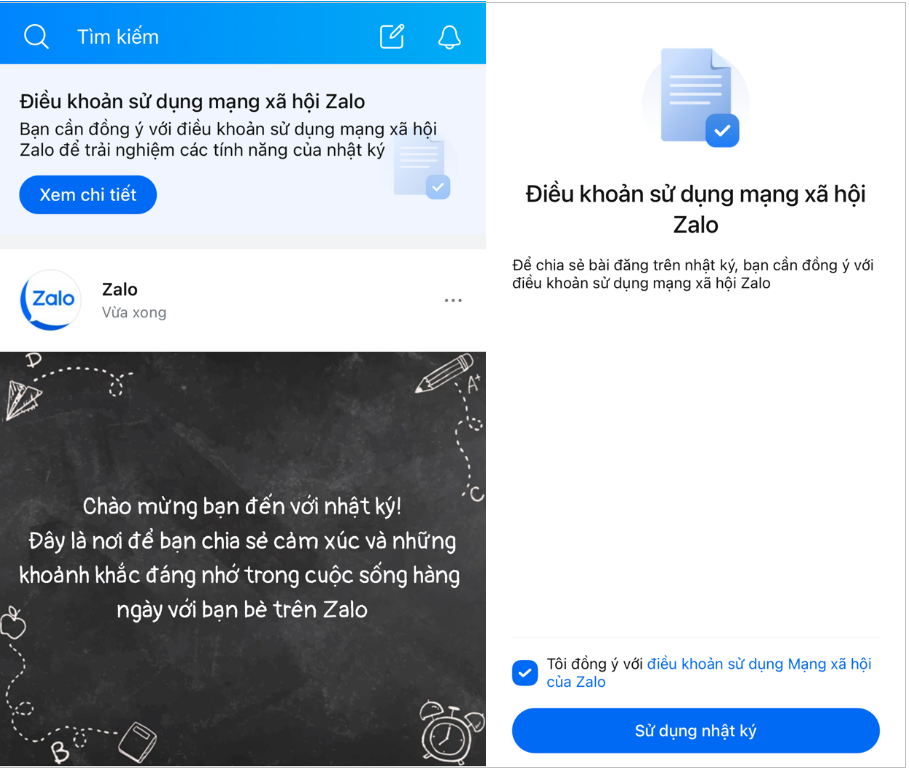 Bước 8: Bạn cần đọc và Đồng ý với Điều khoản sử dụng Mạng xã hội Zalo để tiếp tục sử dụng Nhật ký Zalo.